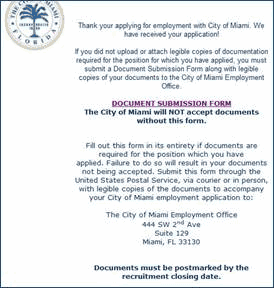 Answer: If your online application has been successfully submitted you will receive a confirmation e-mail shortly after submission. You will also see the confirmation message on your PC screen. We suggest you print a copy of your submitted application and confirmation page information for future reference. If you did not receive a confirmation email shortly after you submitted your application online, check the application status when logged in to view details of the application submitted. Should you require further assistance, contact the City of Miami Employment Office at 305-416-2170