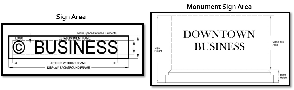 The sign area includes a regular geometric shape, or combination of regular geometric shapes which form or approximate the perimeter of all elements in the display surface. The total sign area allowed can be determined by using the aggregate area calculation formula.