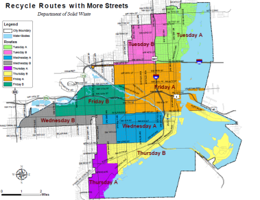 The City of Miami Solid Waste Department provides recycling collection every other week and does not coincide with your garbage collection days. Your recycle route is based on your address. Please refer to the New Recycle Route Map to determine your recycle pick up day. Once you have determined your day, please select your calendar below.
